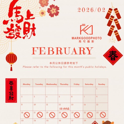 2026 年 02月 公休時間 02/12 營業至12:00 ,下午公休 02/16 - 02/22 全天公休 如有其他臨時公休時間 均已店家實際告知為主 預約拍攝及取件請於營業時段來唷 馬可攝影祝您天天順心